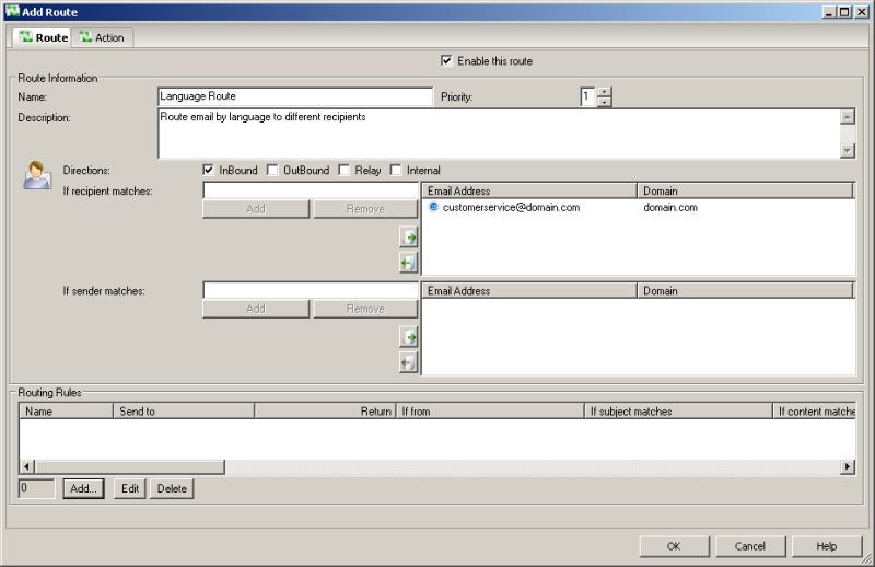 Specify a name for the route and the recipient address(es) to process under If recipient matches