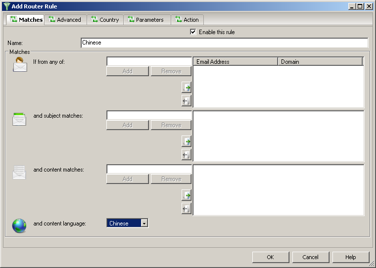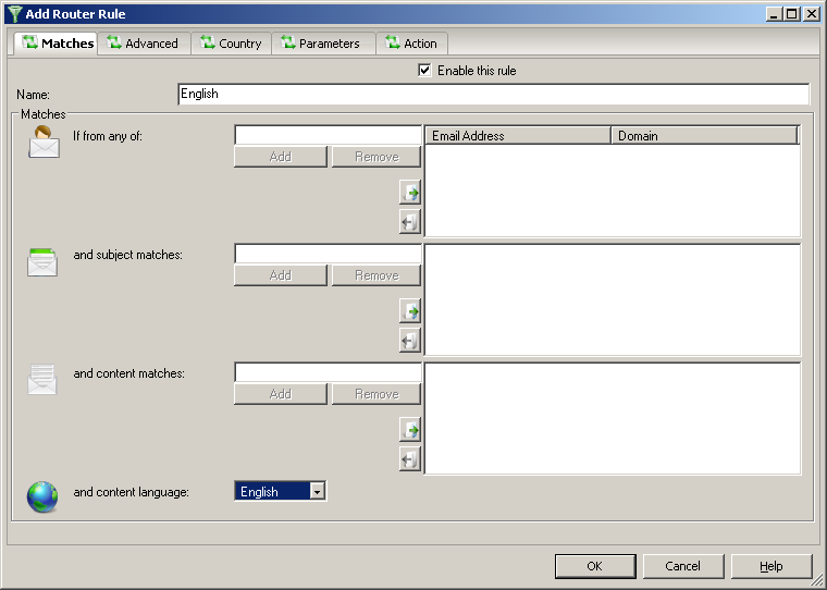 Specify a name for this rule. Set the routing criteria for the rule, all the criteria must match for the rule to trigger. In this case we want to route all email in English. This can be done on the Country page or just using the setting at the bottom of the first page