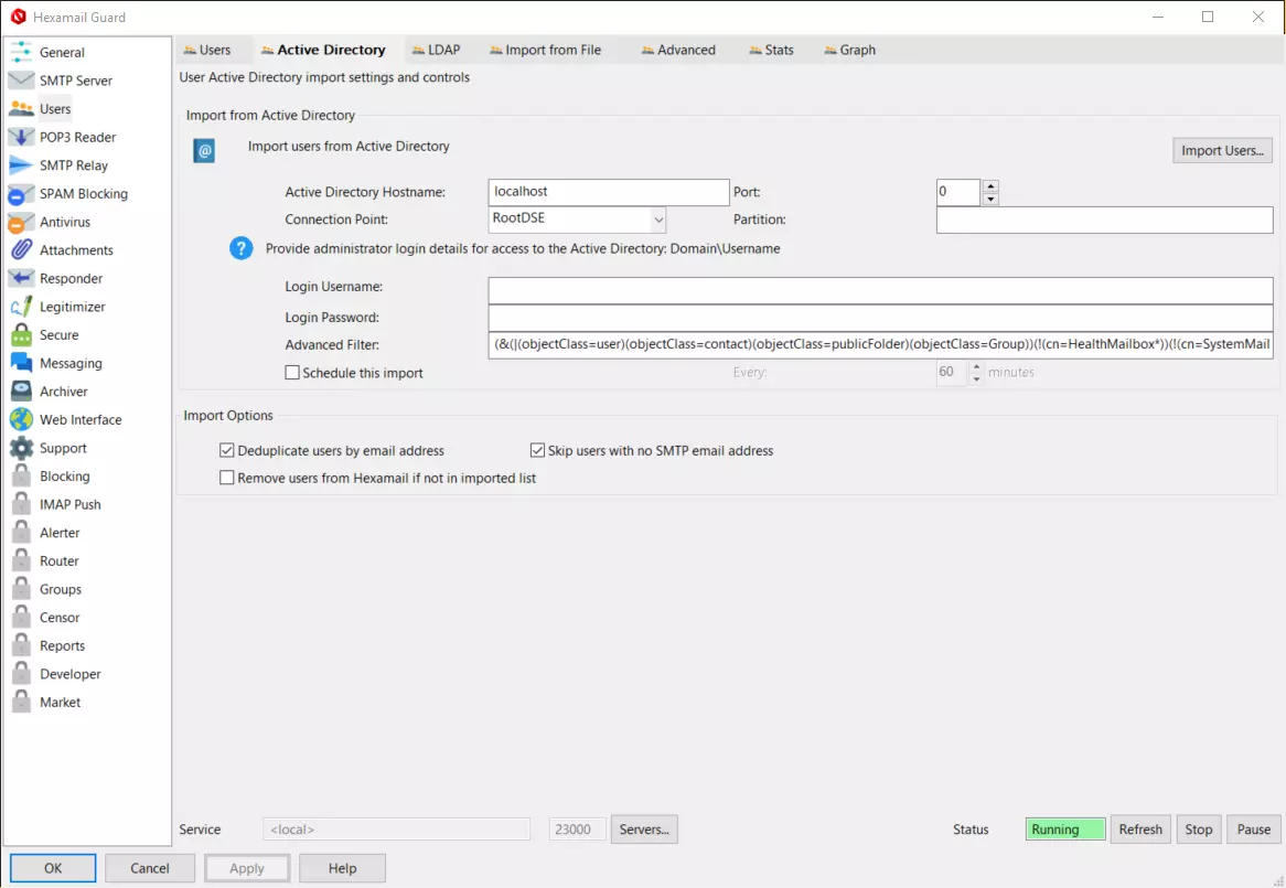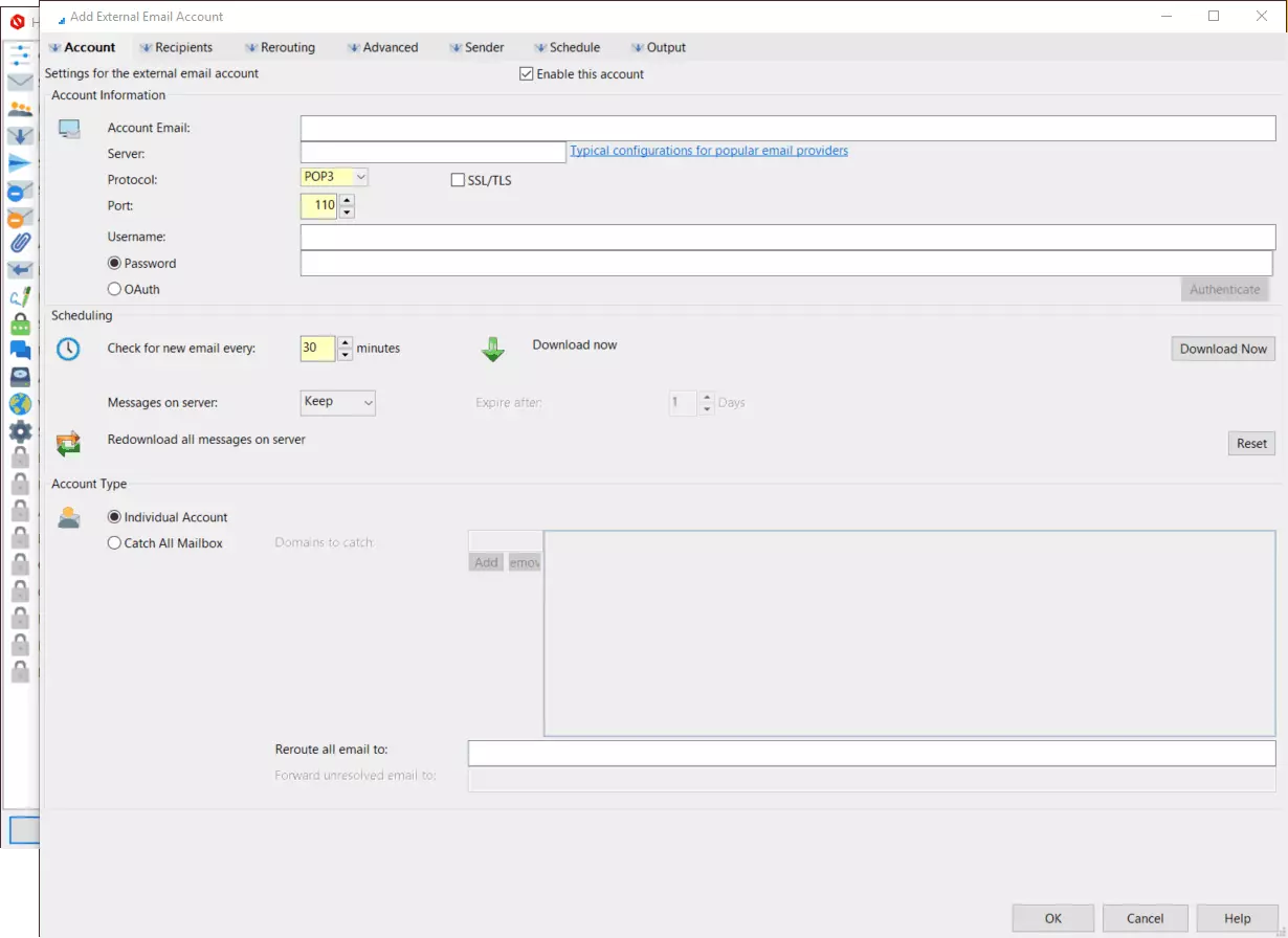A built-in POP3 connector and IMAP connector allows downloading of email from external accounts, processing for spam and virus and delivery to local mailboxes.