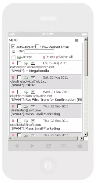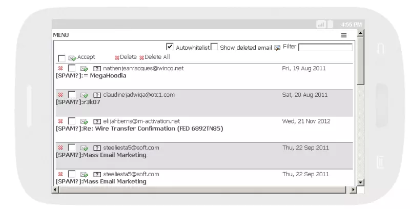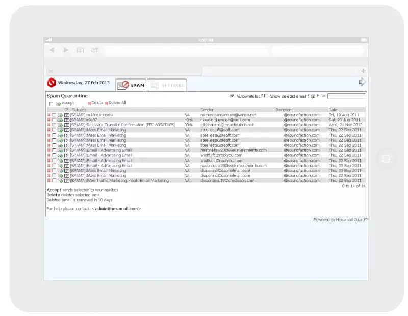 Hexamail's unique highly usable spam Quarantine allows efficient single-click actions to be performed on blocked spam. In a single click you can release an email, whitelist a sender, mark an email subject, forward an email to another recipient or mailbox or delete spam