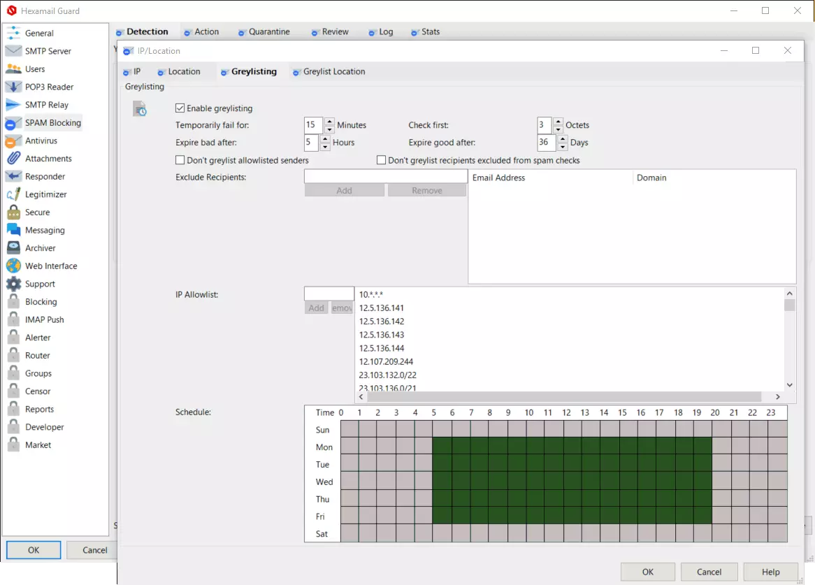Scheduling greylisting (graylisting) of email for out of hours allowing massive reduction in spam with no delays to your incoming email.