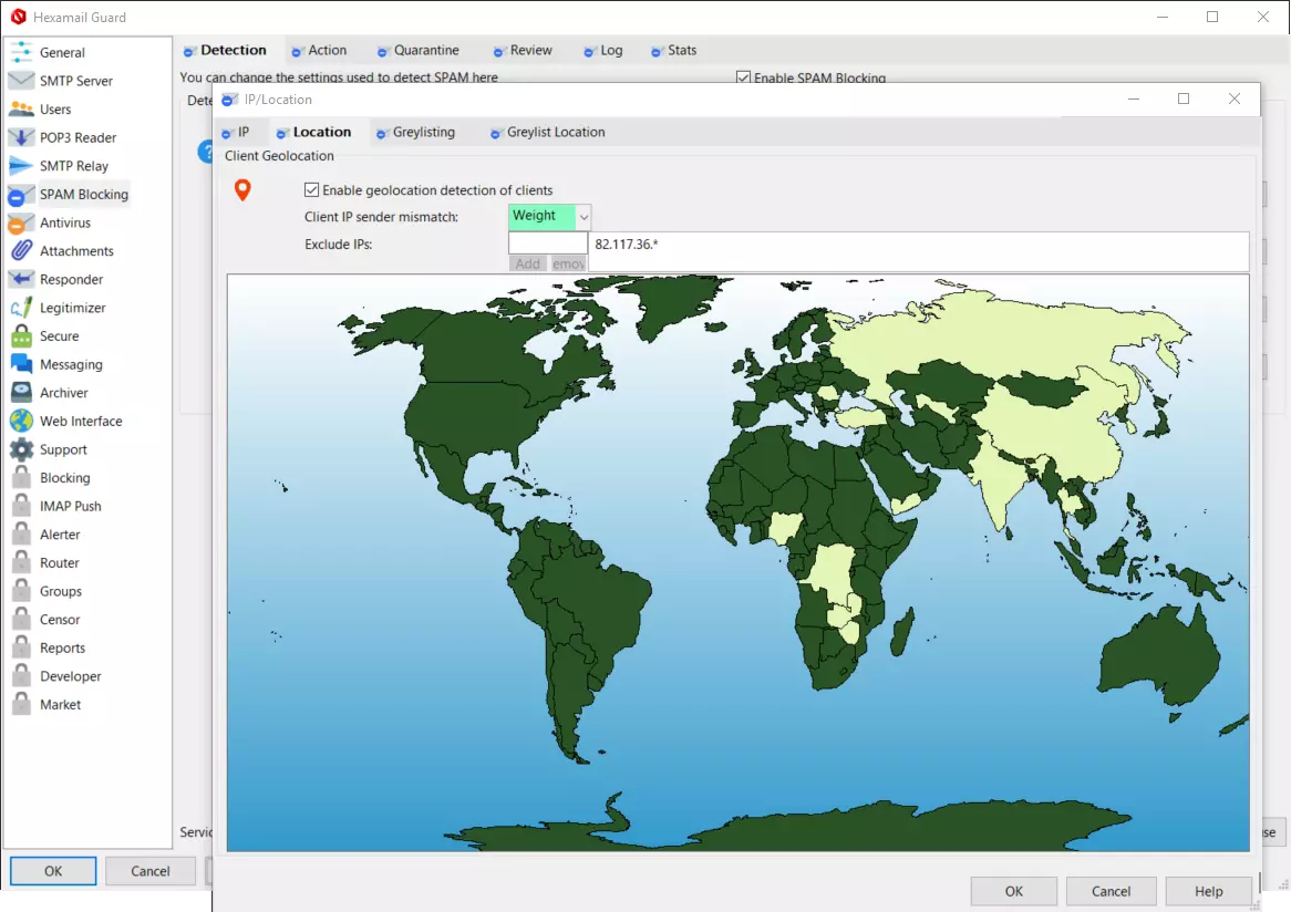 Sender country detection allows you to weight, block or delete email originating from particular countries