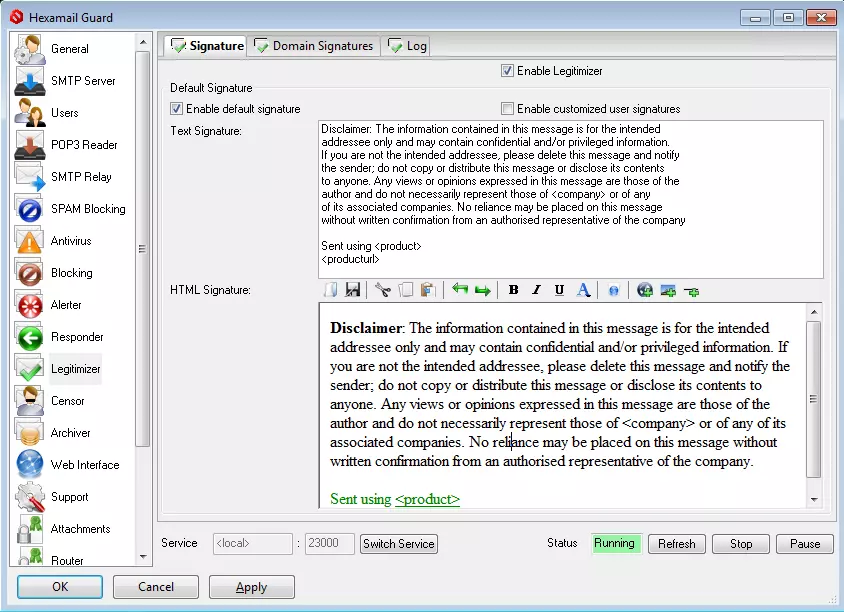 The legitimizer allows you to add text and HTML disclaimers to all outbound email. You can select different signatures for each email domain. HTML can be edited using a WYSIWYG editor or directly by editing the HTML source. Automatic intelligent fuzzy text matching is used to detect any existing disclaimer in the outbound email to avoid re-insertion of the same signature again. This helps prevent multiple disclaimers being inserted into email chains and the resulting email size increases.