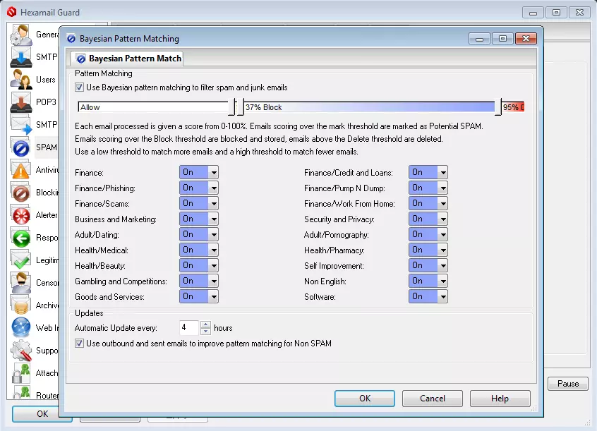 Bayesian Pattern Matching ensures you can take advantage of the most effective SPAM blocking available. Hexamail Bayesian analysis not only inspects the text of the email but also other features drawn from heuristics. This results in unrivalled SPAM recognition rates and almost zero false positives. Each email is given a SPAM score: you can choose to perform different actions on SPAM based on the scores. Choose from marking, forwarding, blocking, or deleting