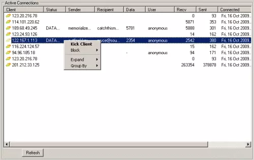 Live activity display shows incoming and outgoing connections as they happen and allows kicking and blocking of connected IPs and sender addresses