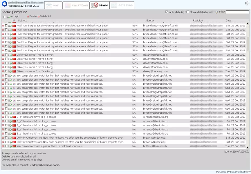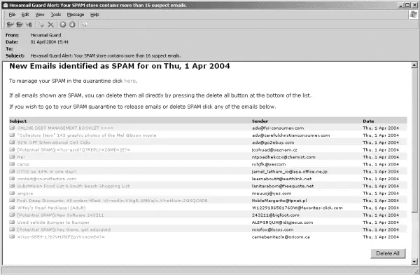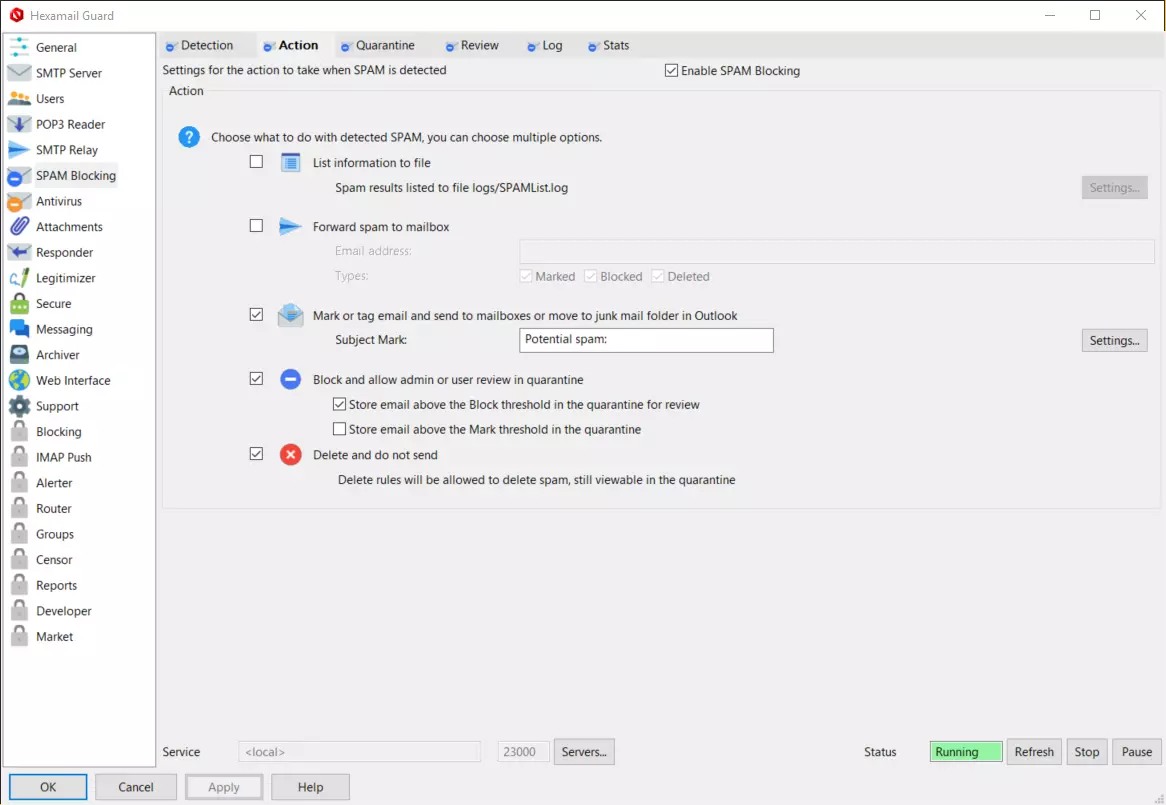 Hexamail Guard allows the ultimate flexibility in dealing with SPAM. You can simply list incoming SPAM to a file, forward all SPAM to a nominated email account, mailbox or public folder, mark the emails and send to the recipients, block the SPAM in a quarantine for later review by the Administrator or users, or delete SPAM immediately.