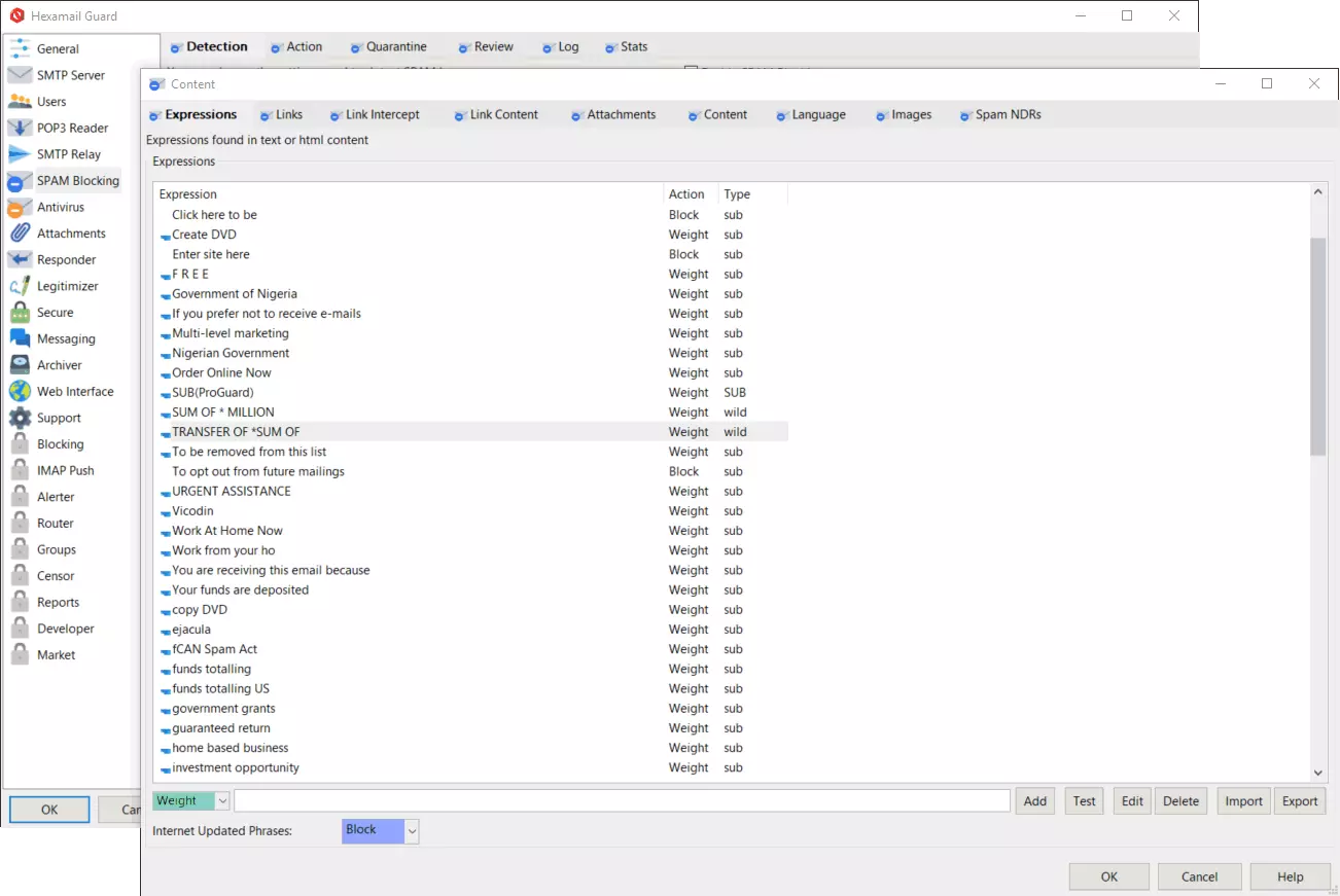 Advanced expression matching allows you to customize the SPAM blocking to your needs. Allow, Mark, Weight, Block or Delete email senders, subjects, content, urls, or attachments matching your own defined rules. Rules can include wildcards, substrings, words, regular expressions and boolean operators.