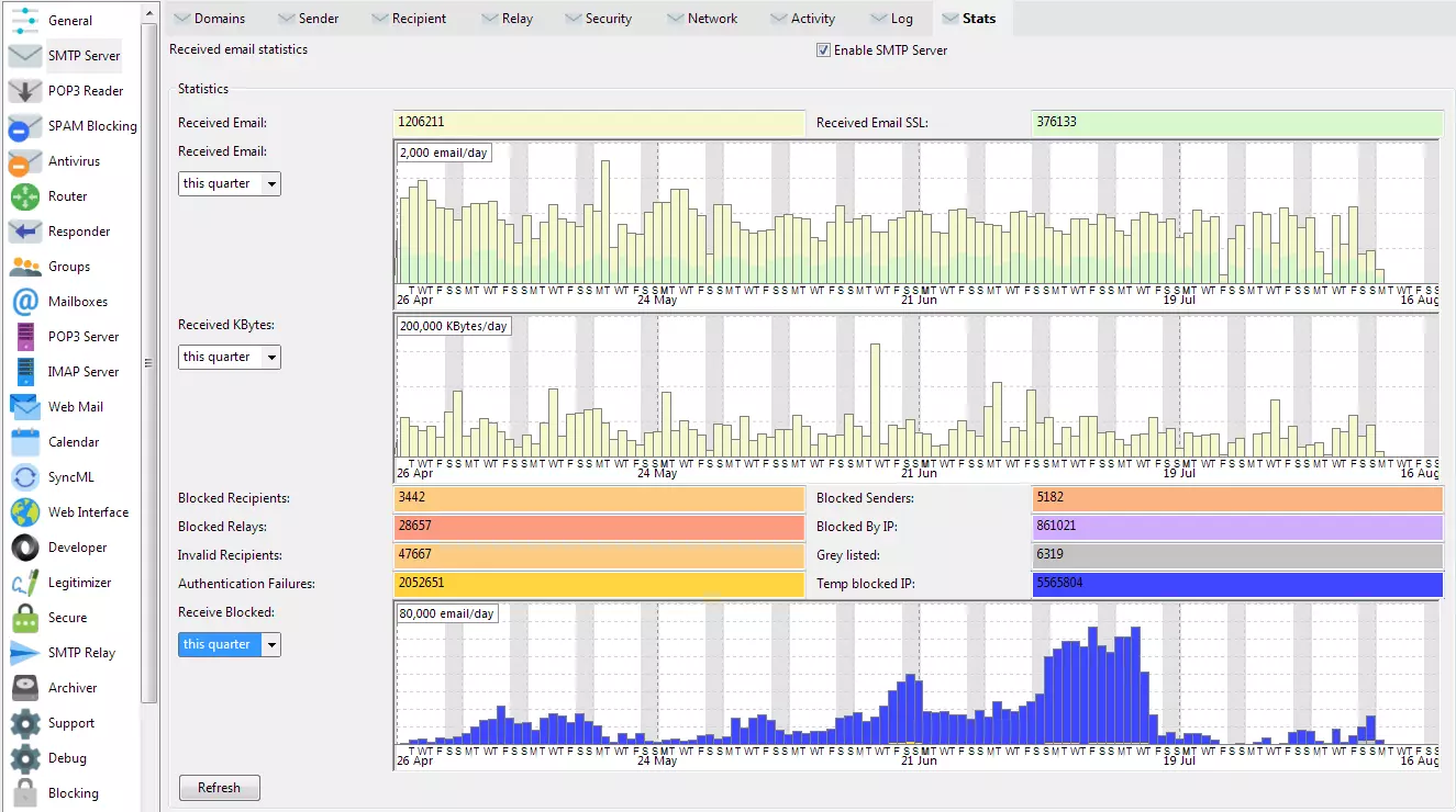 A variety of useful statistics are available to help you measure the volume of SPAM being blocked, the percentage of received email that is SPAM and the SPAM per hour.