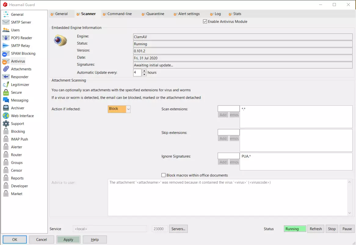 Optional antivirus module offers an industry leading antivirus scanner engine, ClamAV, to ensure collected email arriving at your server is virus and malware free.