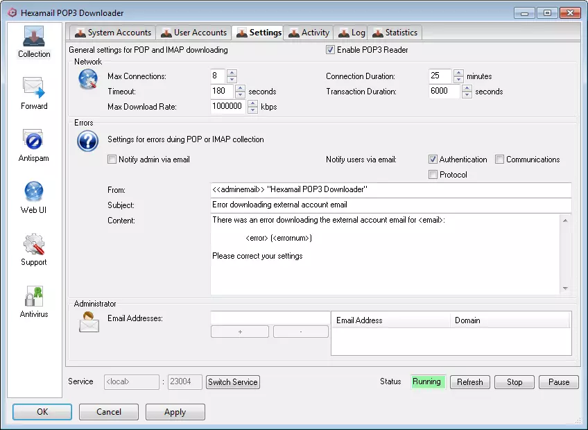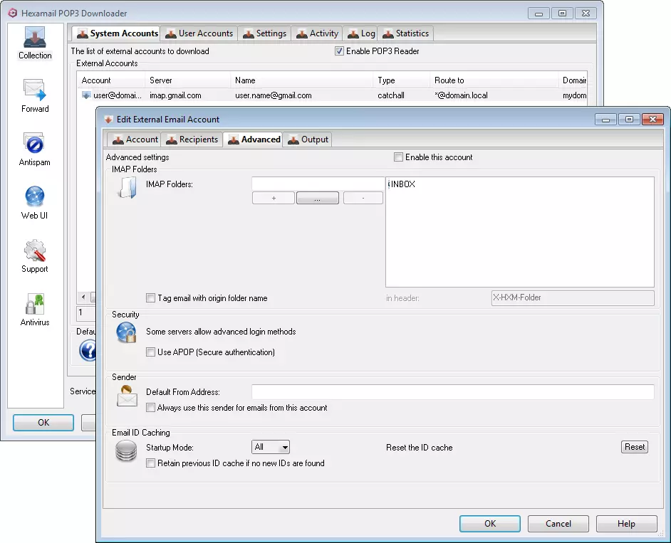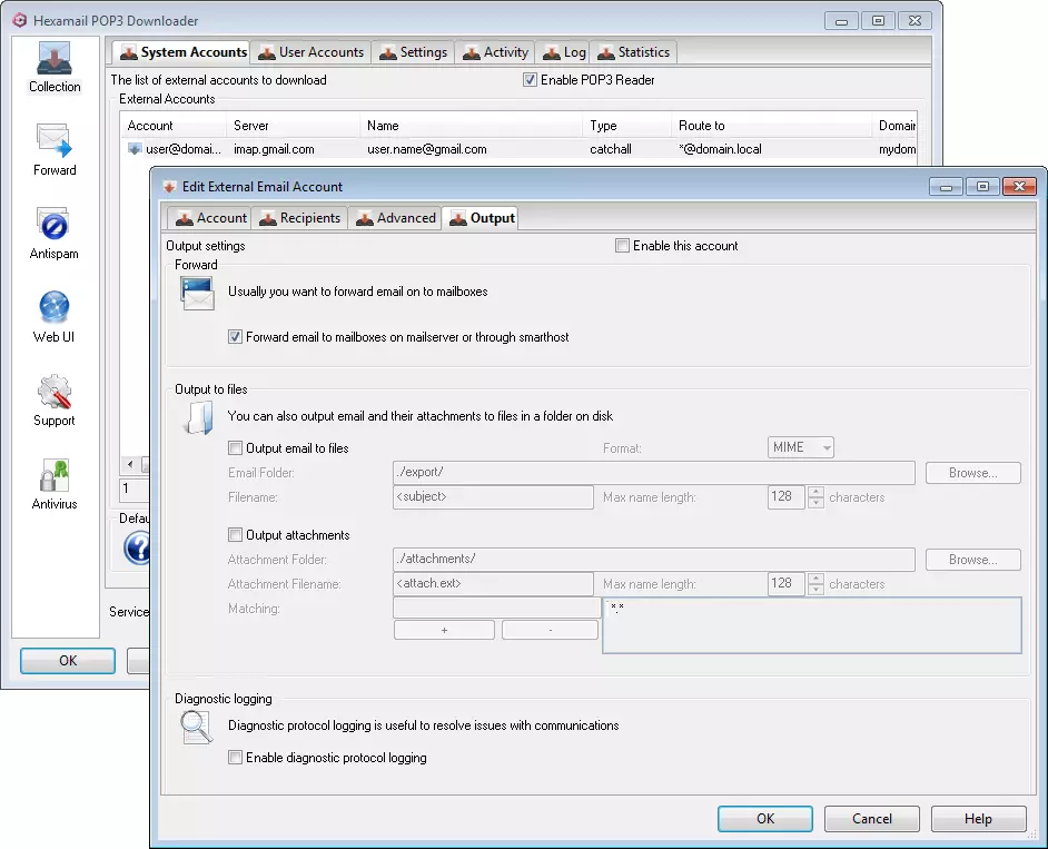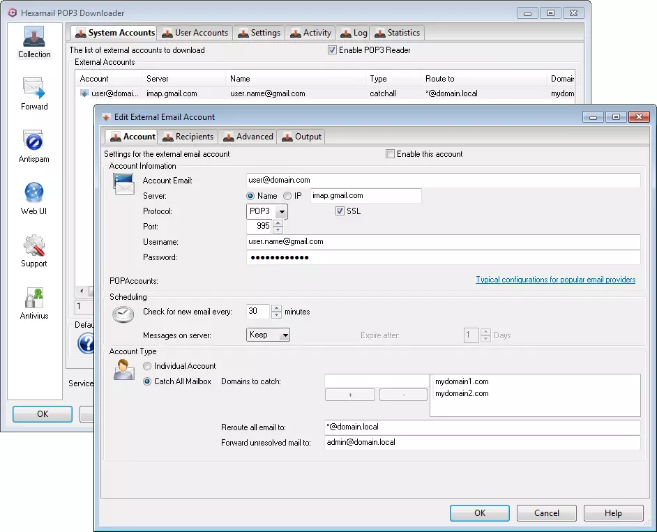 You can set up multiple administrator controlled system accounts to collect email from multiple separate servers for individual users or catch-all email boxes. Each account can have its own schedule, removal action, routing rules, and output settings.