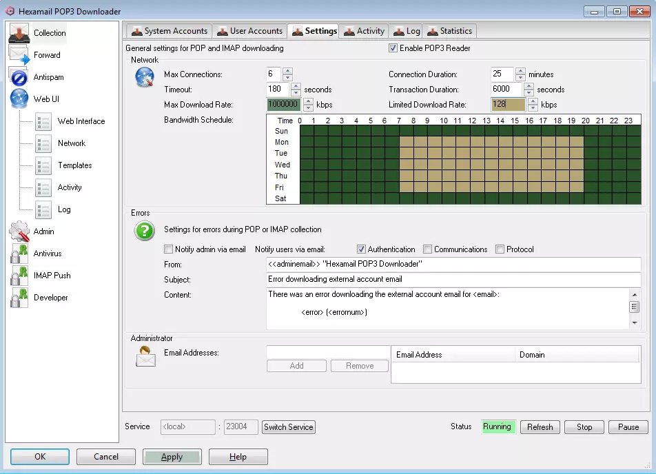Comprehensive settings for controlling number of connections, bandwidth usage, error messages and notifications.