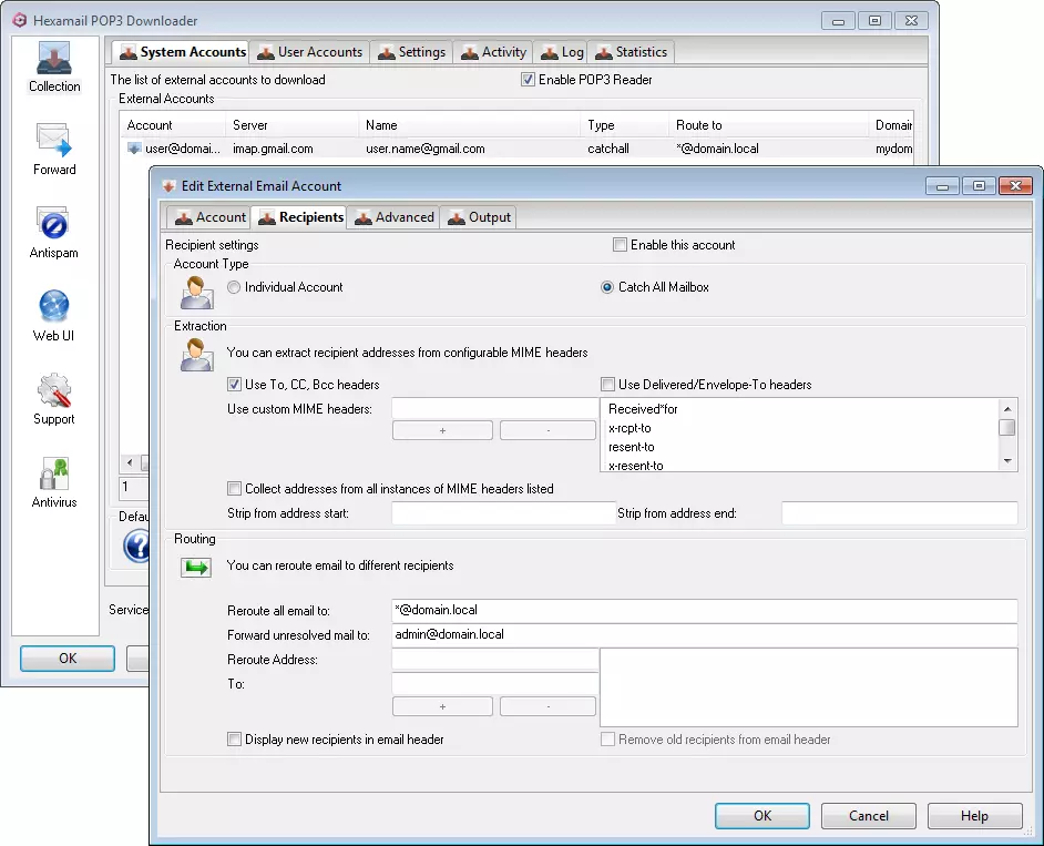 Advanced recipient extraction and remapping ensures that Hexamail can interoperate with all mailservers regardless of the ISP/provider. You can catch all email addresses for domain(s) and remap specific addresses to new local emailboxes or route all email to a single mailbox.