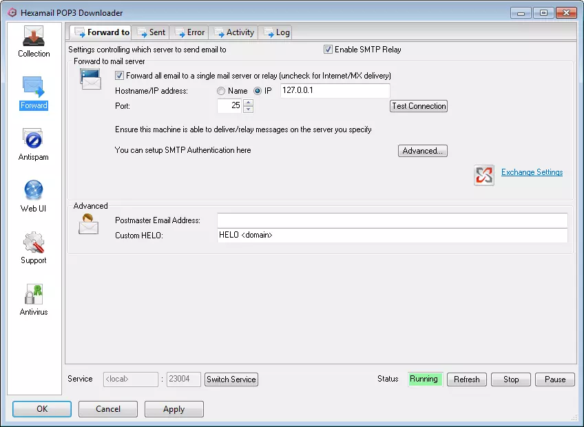 Full SMTP relay module allows forwarding to ANY SMTP server, local or remote. Fully compatible with all Exchange versions AND any other SMTP server. Simple to configure and use. Activity logging and statistics